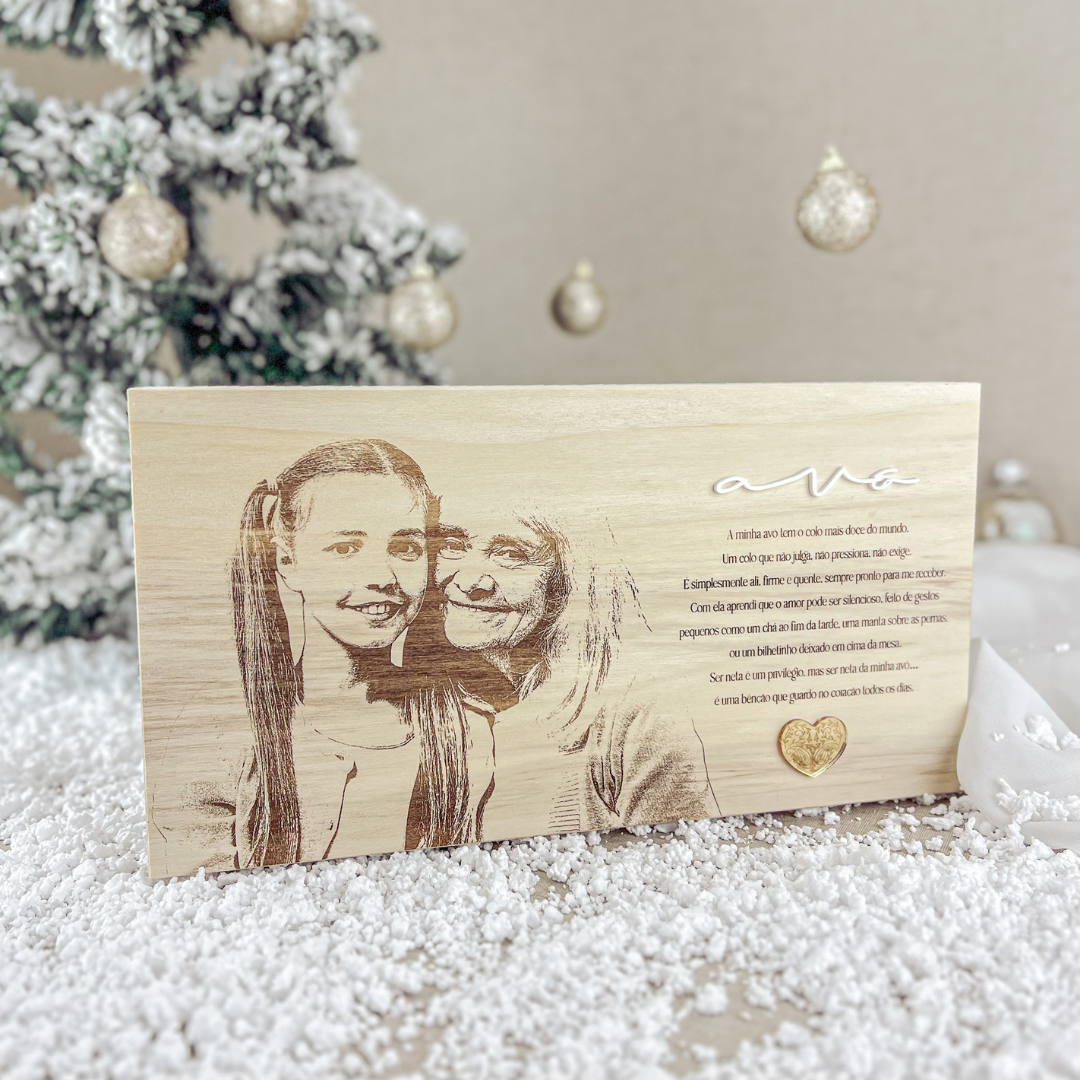 Feito em bétula, este bloco grava a imagem diretamente na madeira, com a palavra “Avó” em destaque e um coração dourado que simboliza amor e gratidão.
