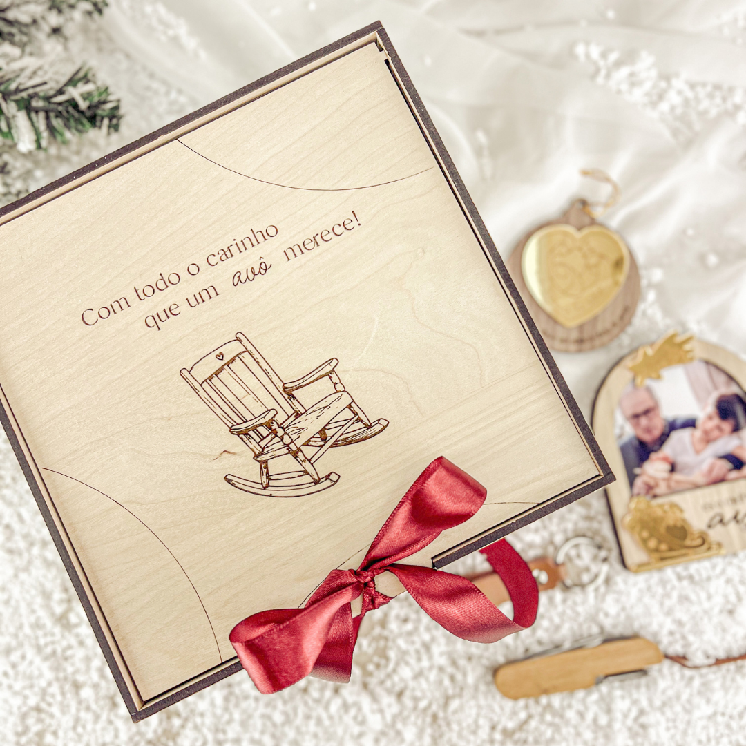 Produzida em madeira de bétula e carvalho, apresenta na tampa a frase “Com todo o carinho que um avô merece” e a gravação de uma cadeira de balanço, símbolo de calma, sabedoria e amor familiar.
