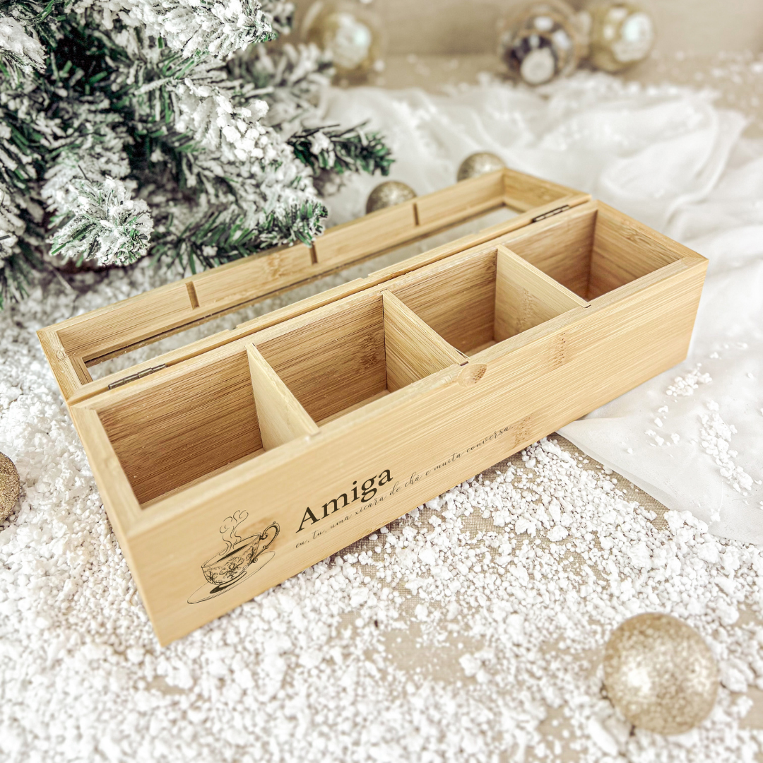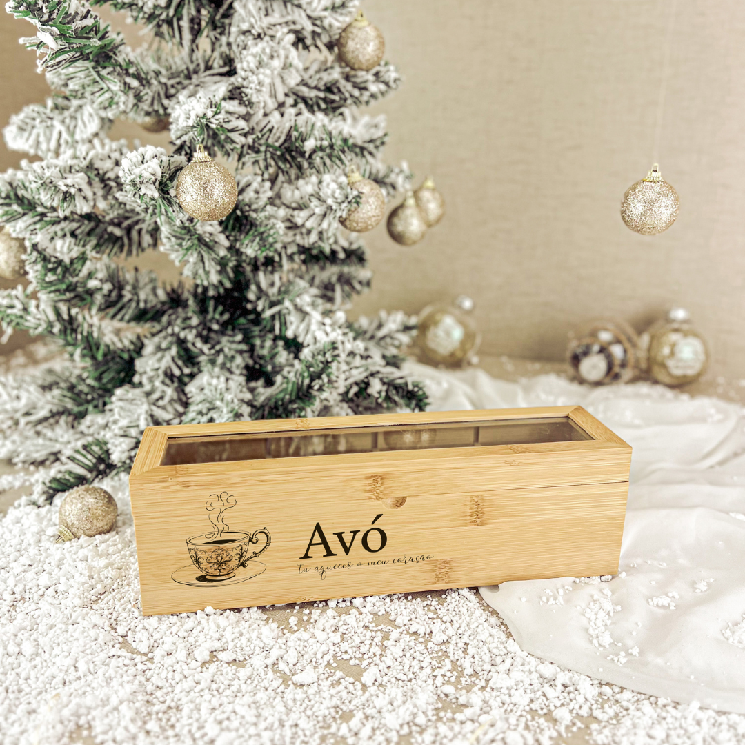 Feita em bambu, esta caixa de chá combina simplicidade e significado, com a frase gravada “Avó, tu aqueces o meu coração”.