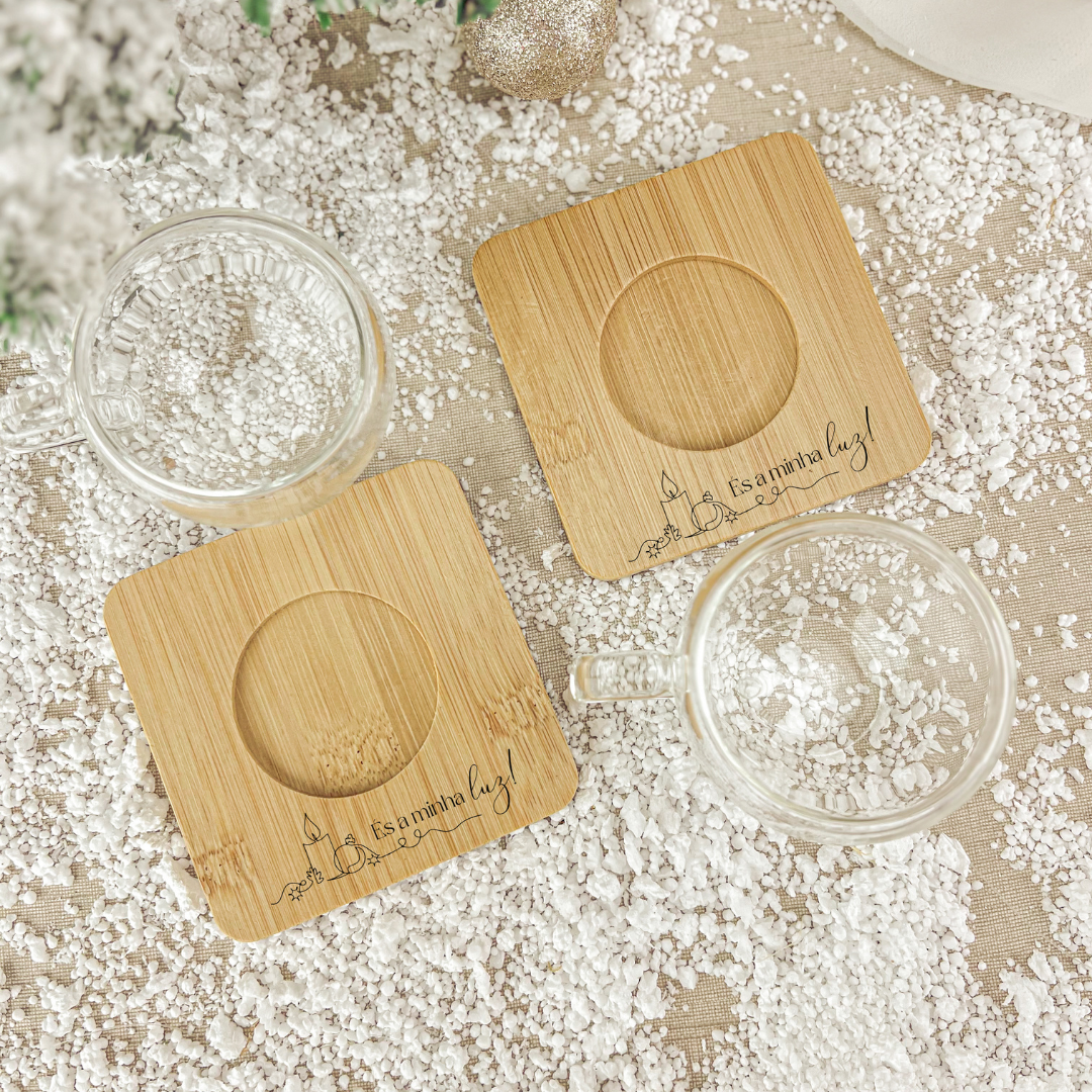 Este conjunto inclui duas chávenas de vidro (90ml) acompanhadas por pires em bambu natural, gravados com a frase “És a minha luz”.