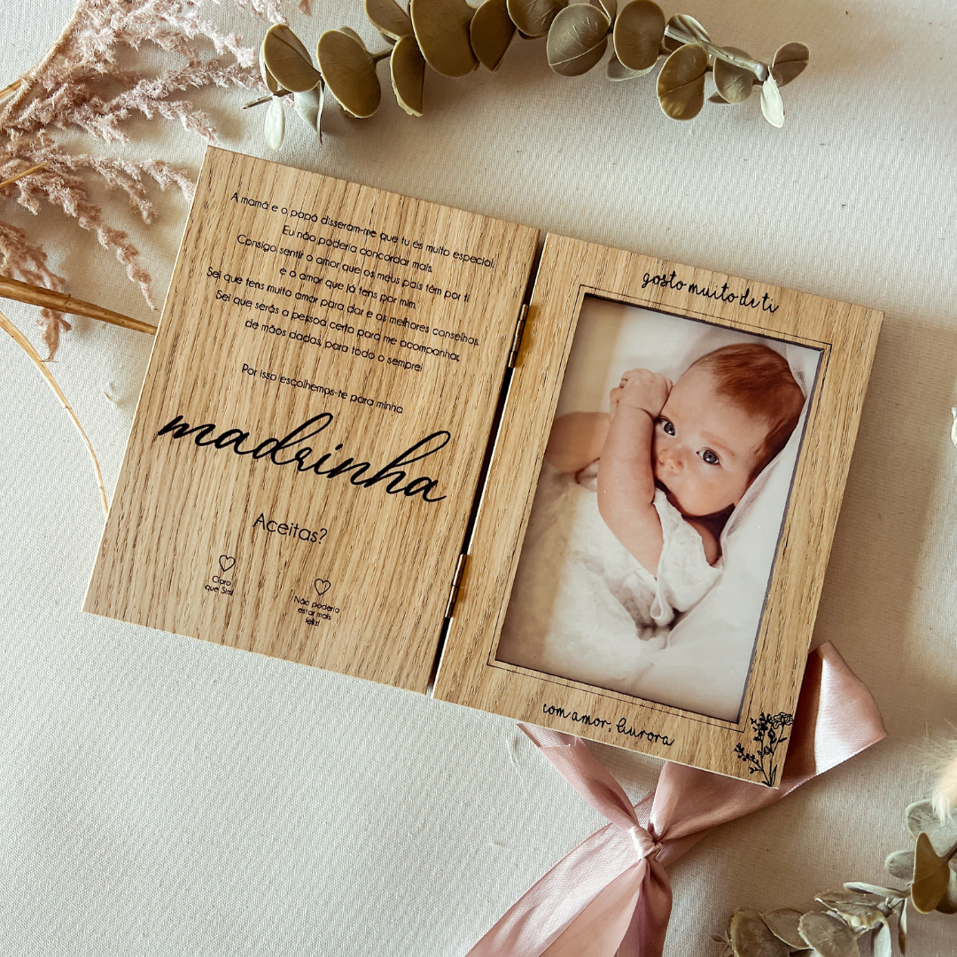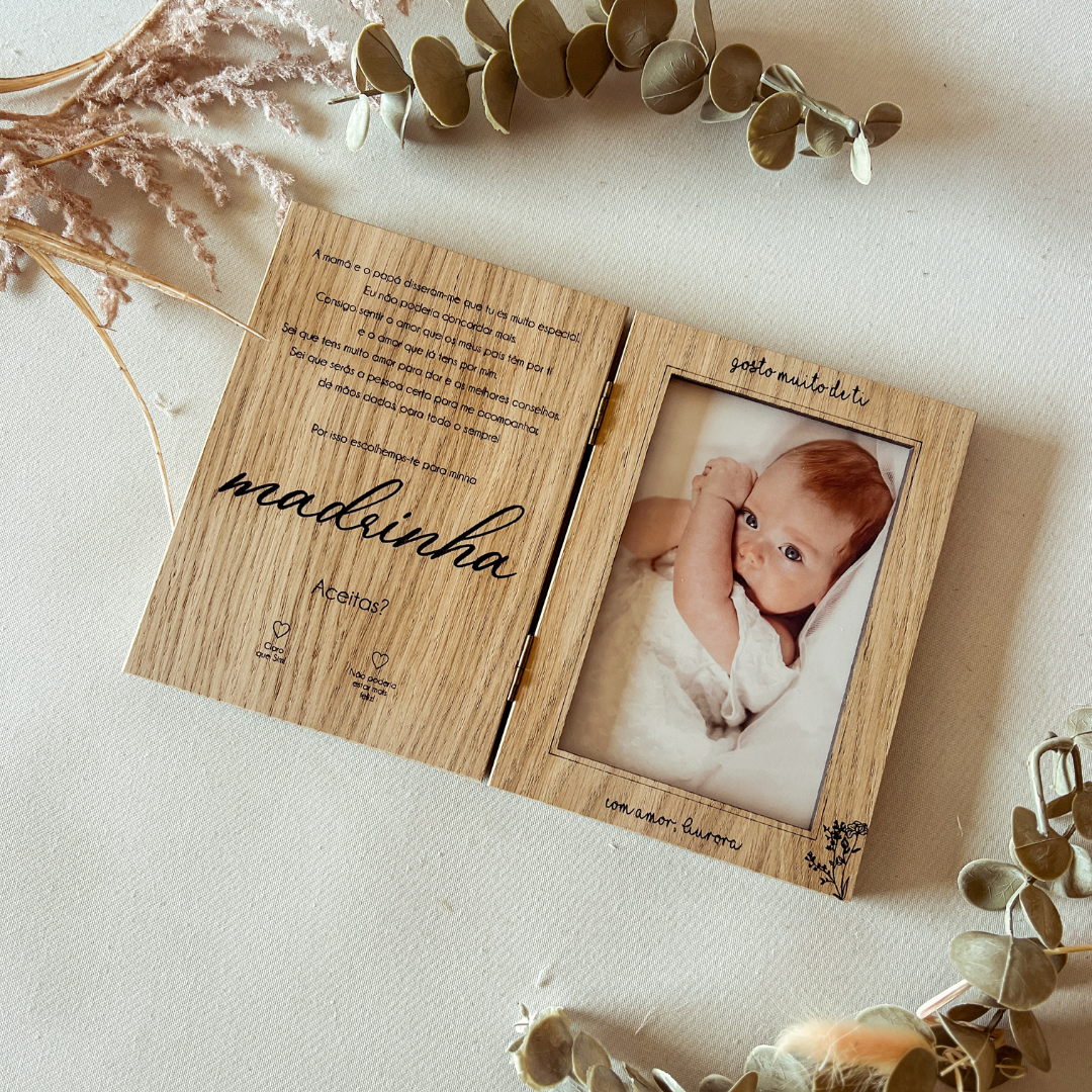 Feito em madeira de carvalho e com dimensões de 13x18cm, abre-se como um livro: na primeira página, a mensagem tocante já incluída; na segunda, o espaço para uma fotografia vertical (10x15cm) da madrinha com a criança — tornando-o um verdadeiro tesouro emocional.