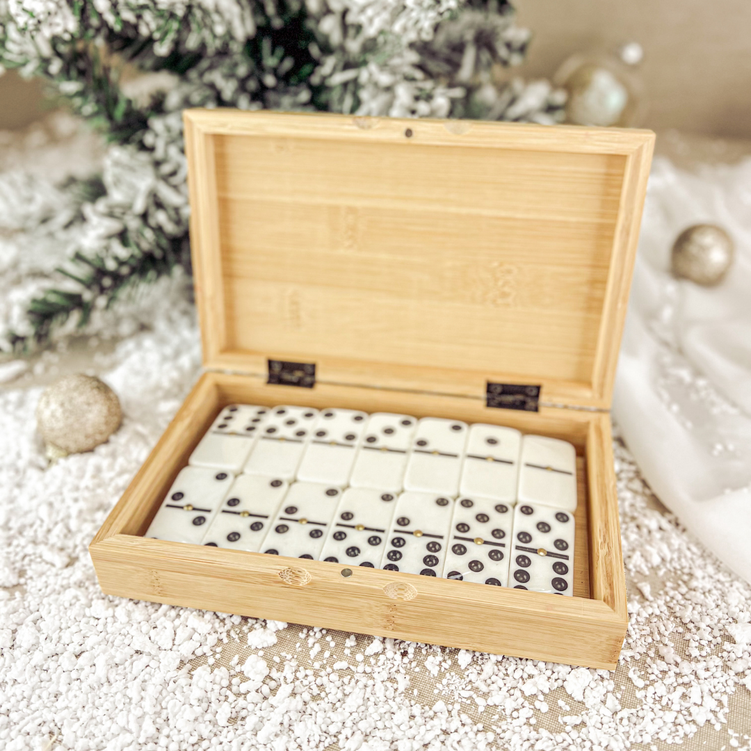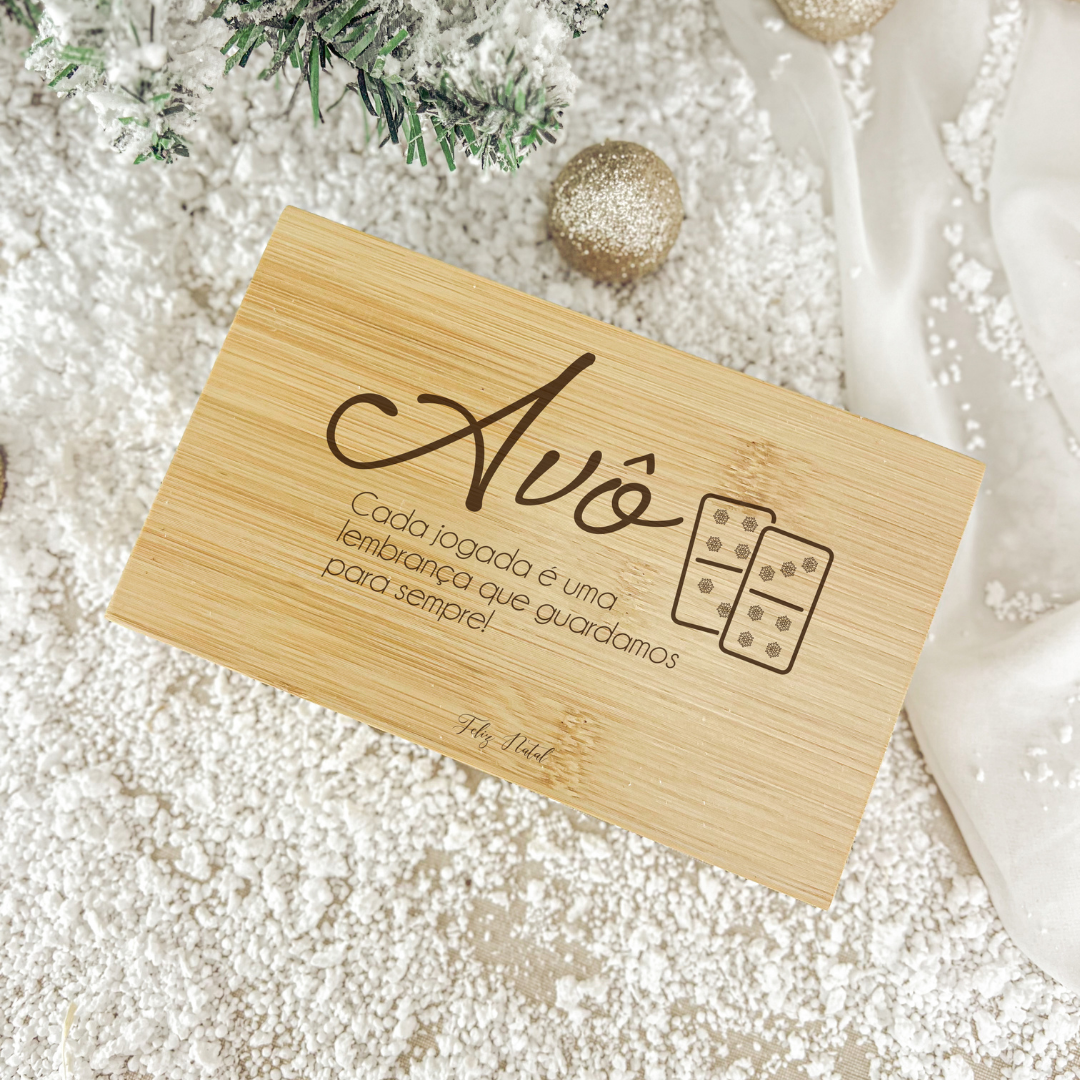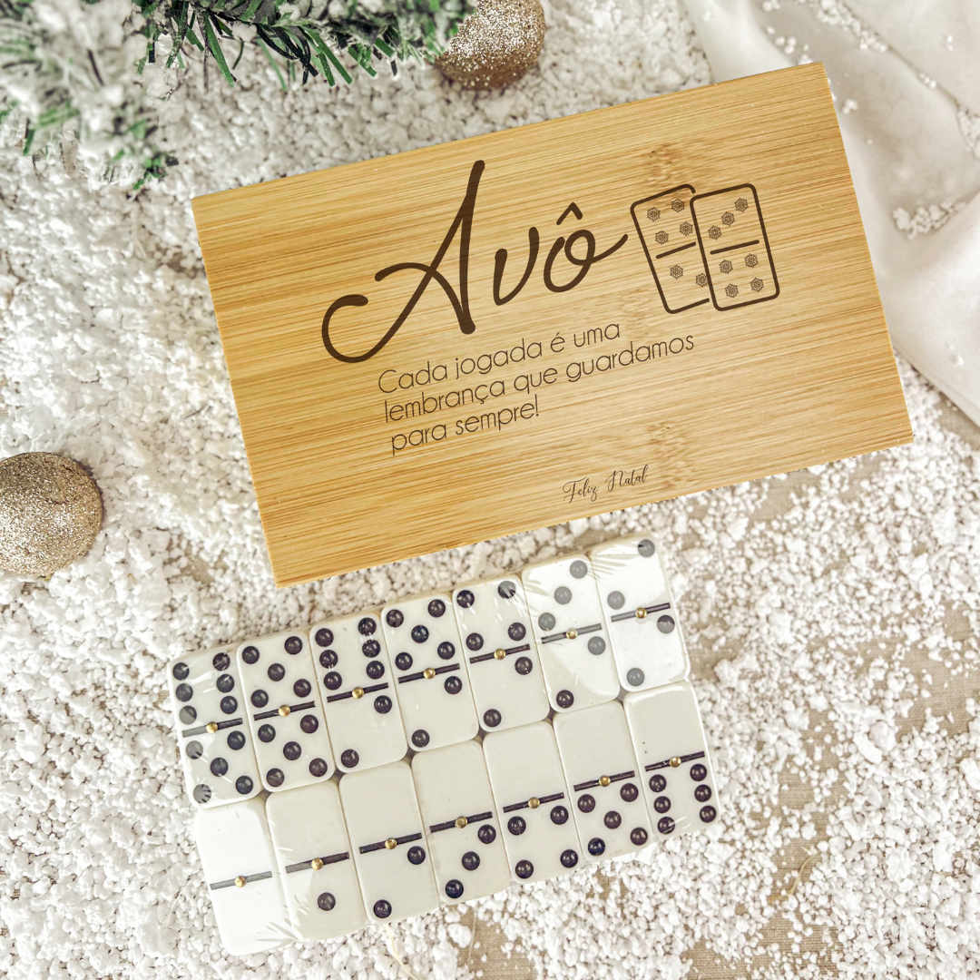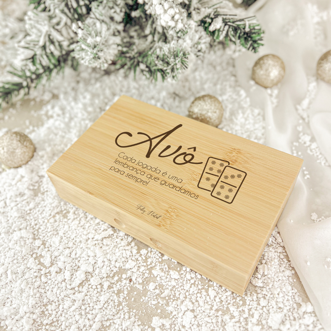 Este jogo de dominó com 28 peças em melamina vem numa caixa de bambu lacado com fecho magnético, gravada com a frase “Avô, cada jogada é uma lembrança que guardamos para sempre”.
