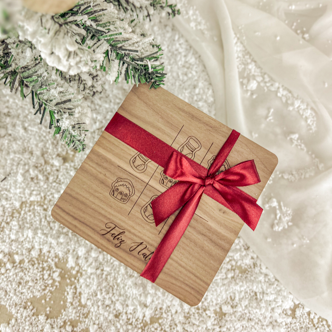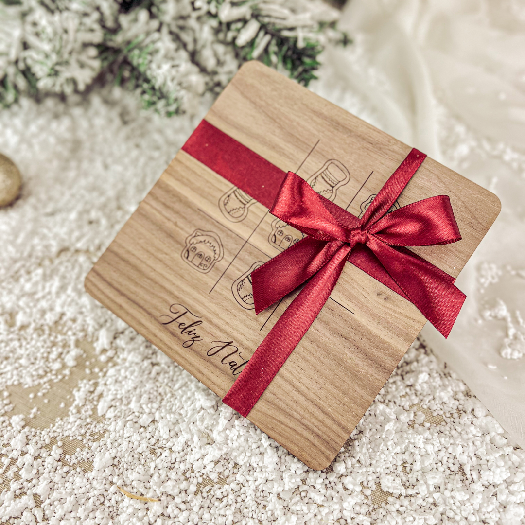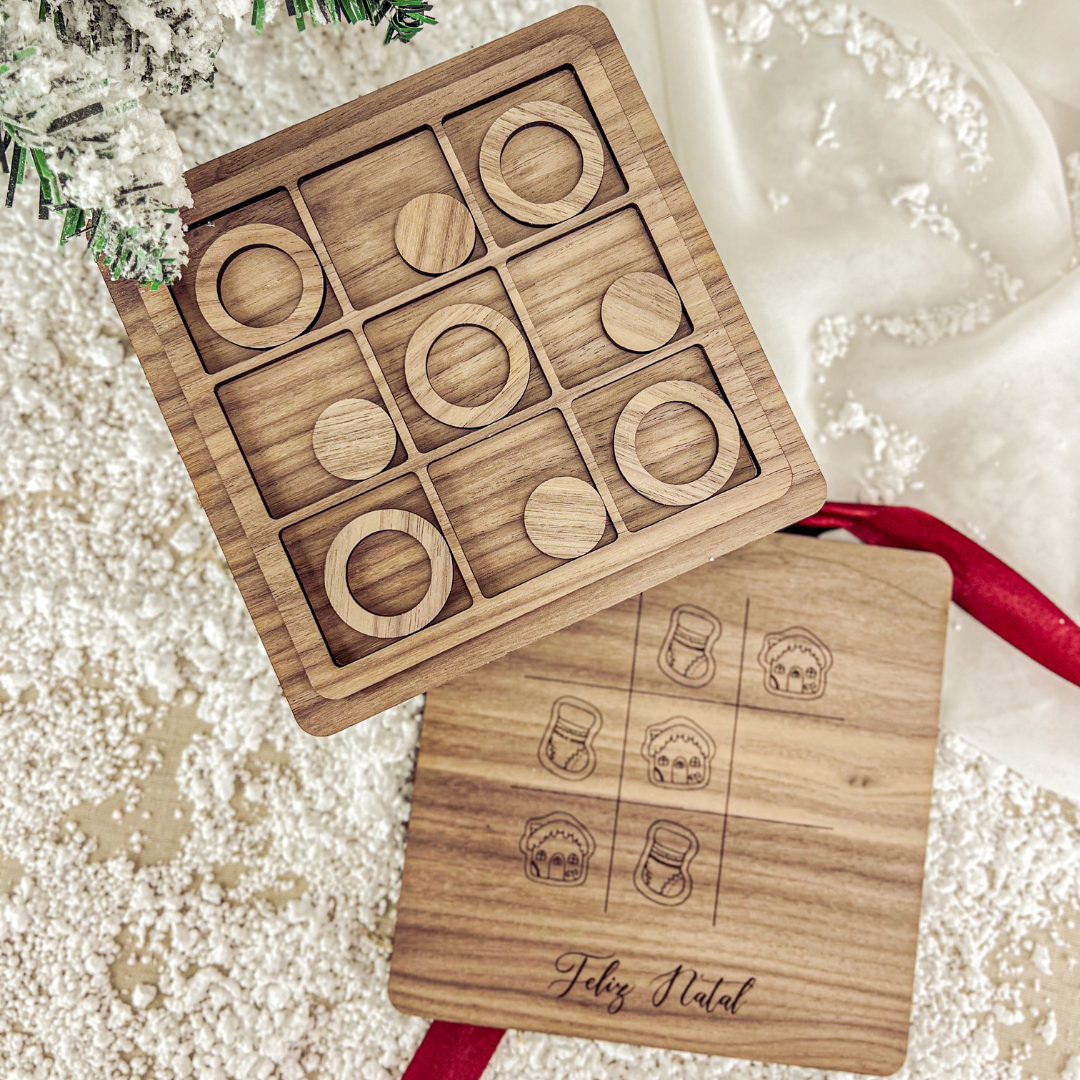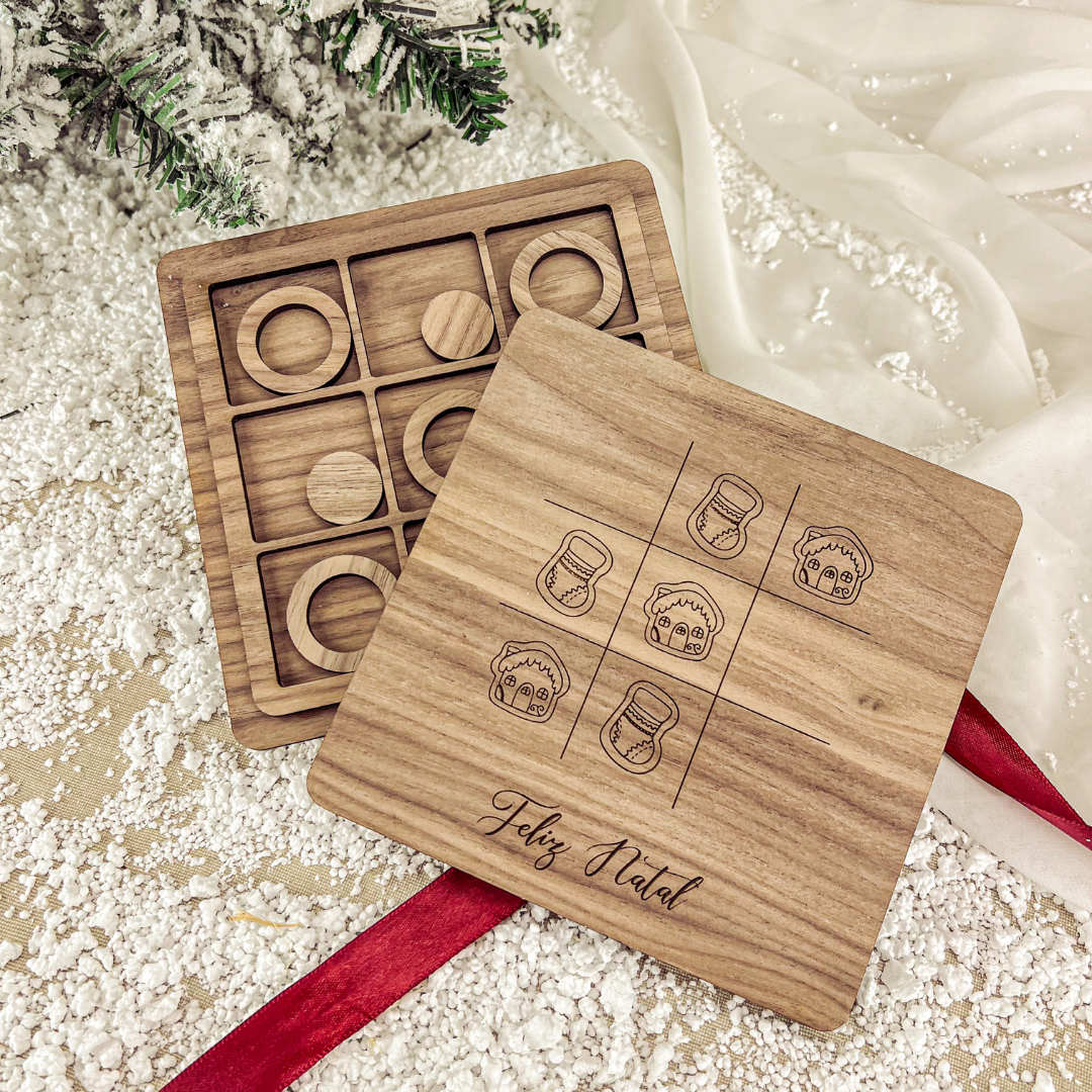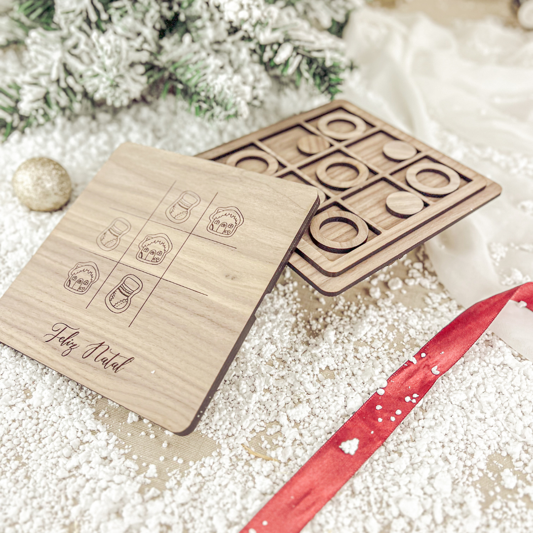 Feito em madeira de nogueira, este Jogo do Galo apresenta o tradicional tabuleiro, com a expressão “Feliz Natal” gravada na capa, acompanhada de botas de Natal e casas de gengibre.