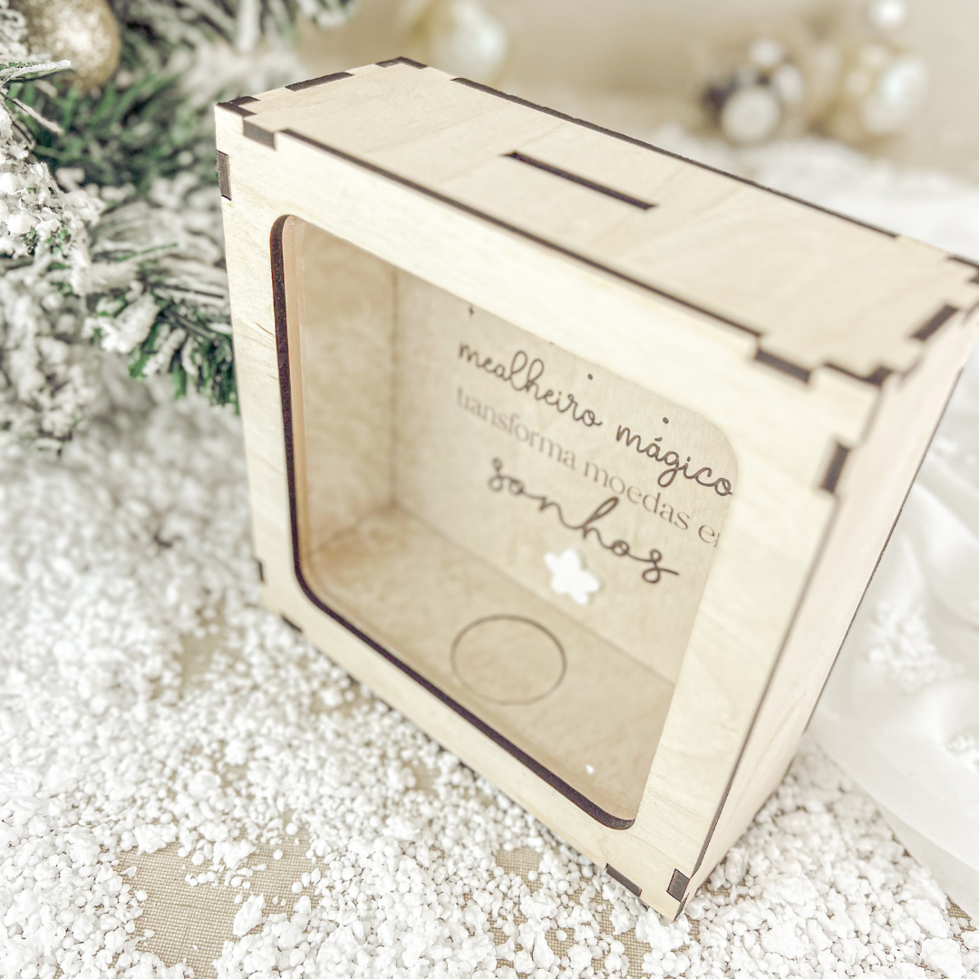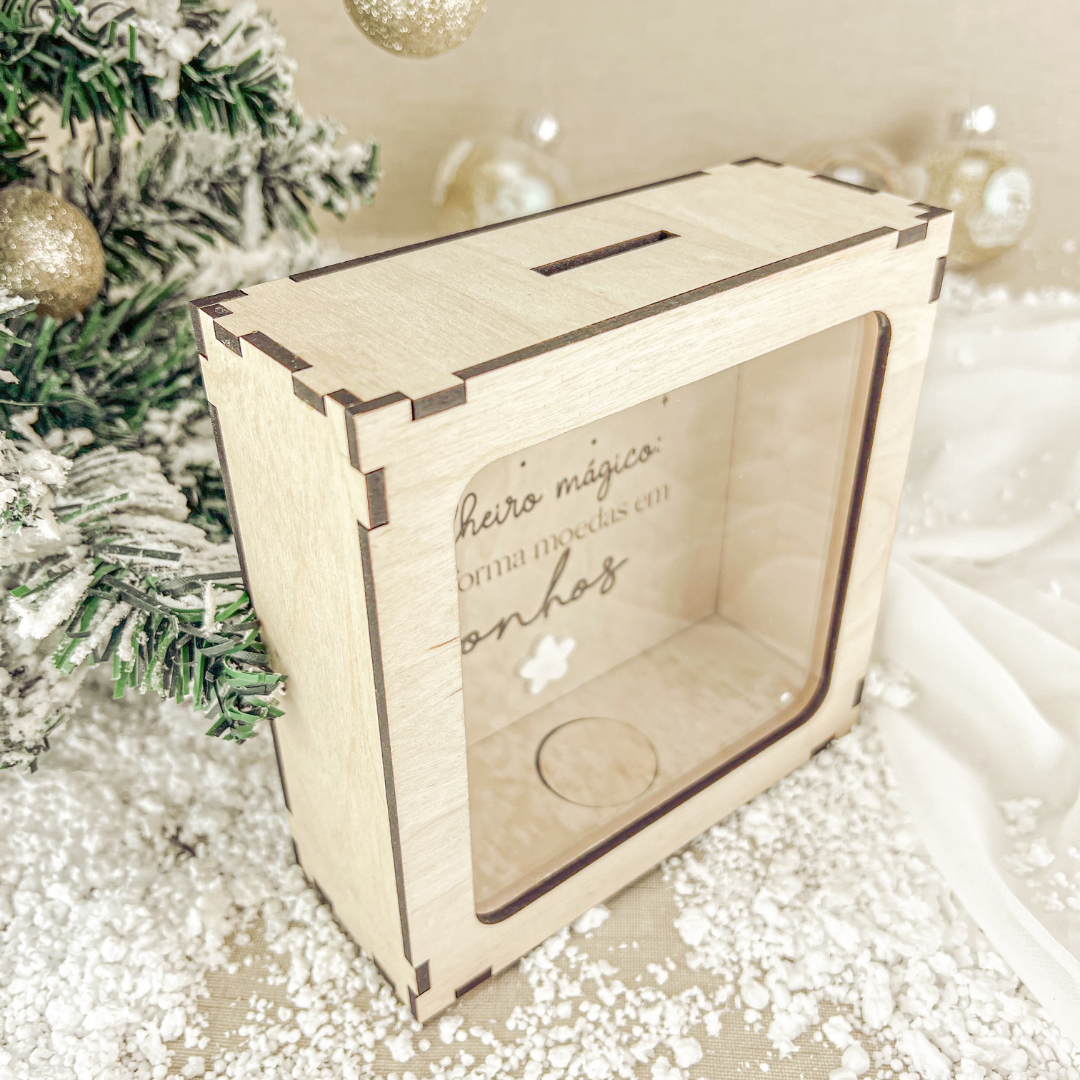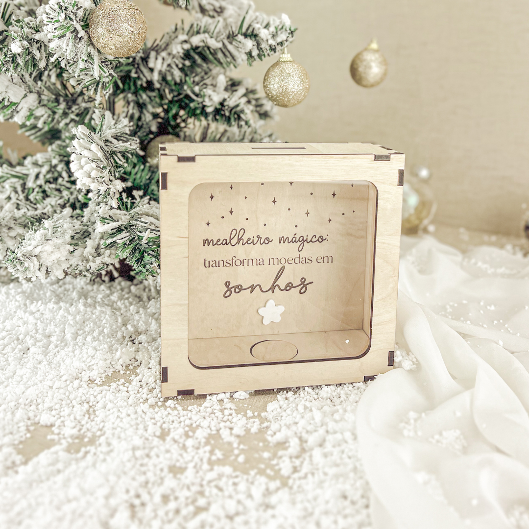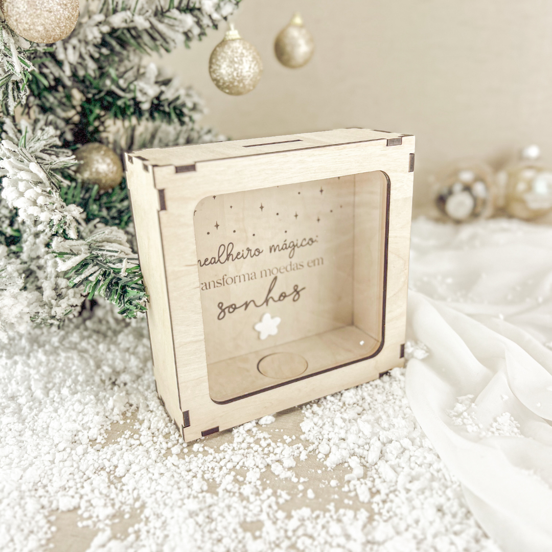 No interior, a gravação “Mealheiro mágico: transforma moedas em sonhos” dá um toque especial e inspirador, tornando-o uma prenda perfeita para o Natal.