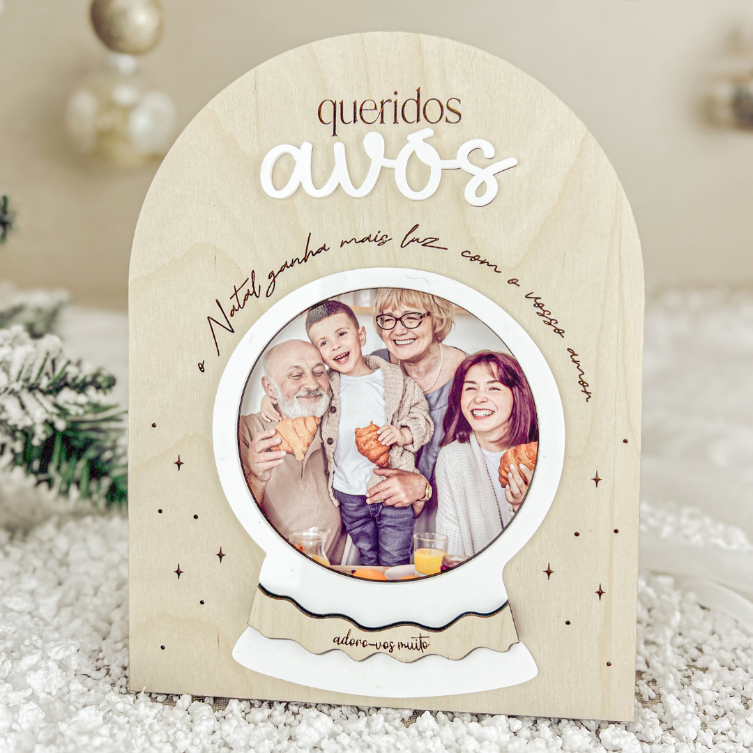 Produzida em bétula, com a palavra “Avós” e rebordo em acrílico branco, é uma prenda de Natal perfeita para encher o coração de quem cuida com amor.