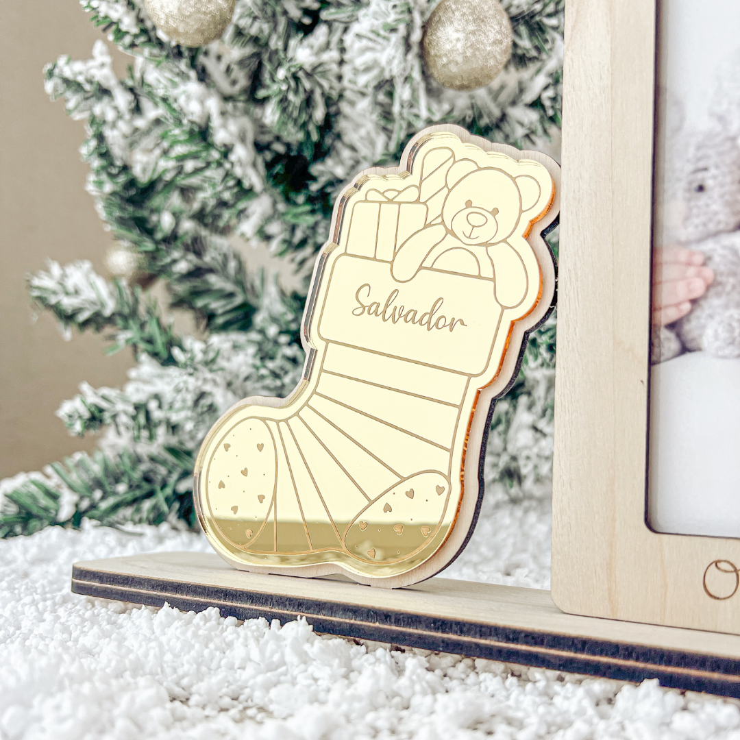 Esta moldura em pau-ferro combina o calor da madeira com o brilho da bota dourada em acrílico, gravada com o nome da criança. Abaixo da fotografia, a inscrição “O meu primeiro Natal” transforma esta peça numa recordação única e cheia de ternura.
