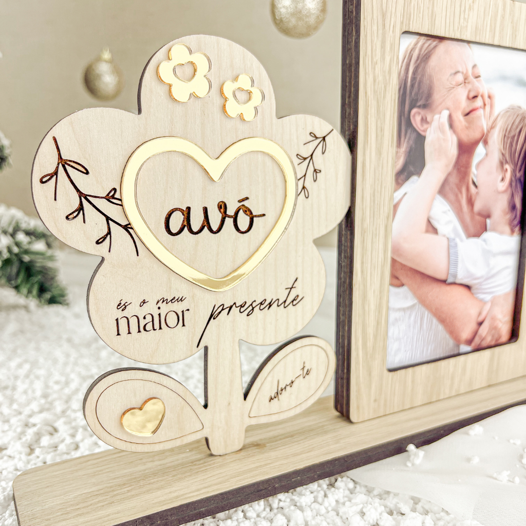 Esta moldura em carvalho e bétula combina a naturalidade da madeira com o brilho suave da flor dourada em acrílico, gravada com as frases “Avó, és o meu maior presente” e “Adoro-te”.