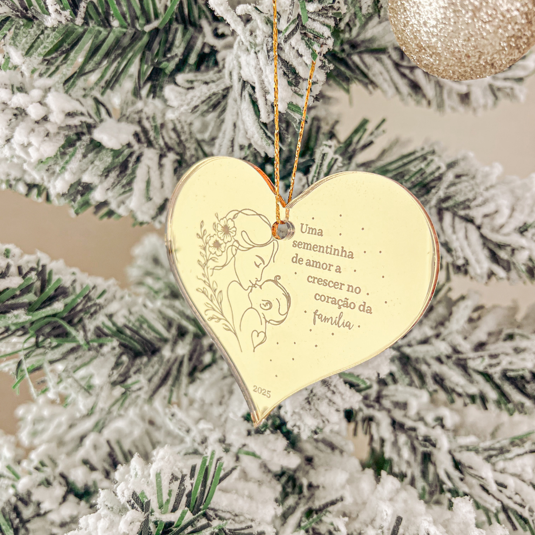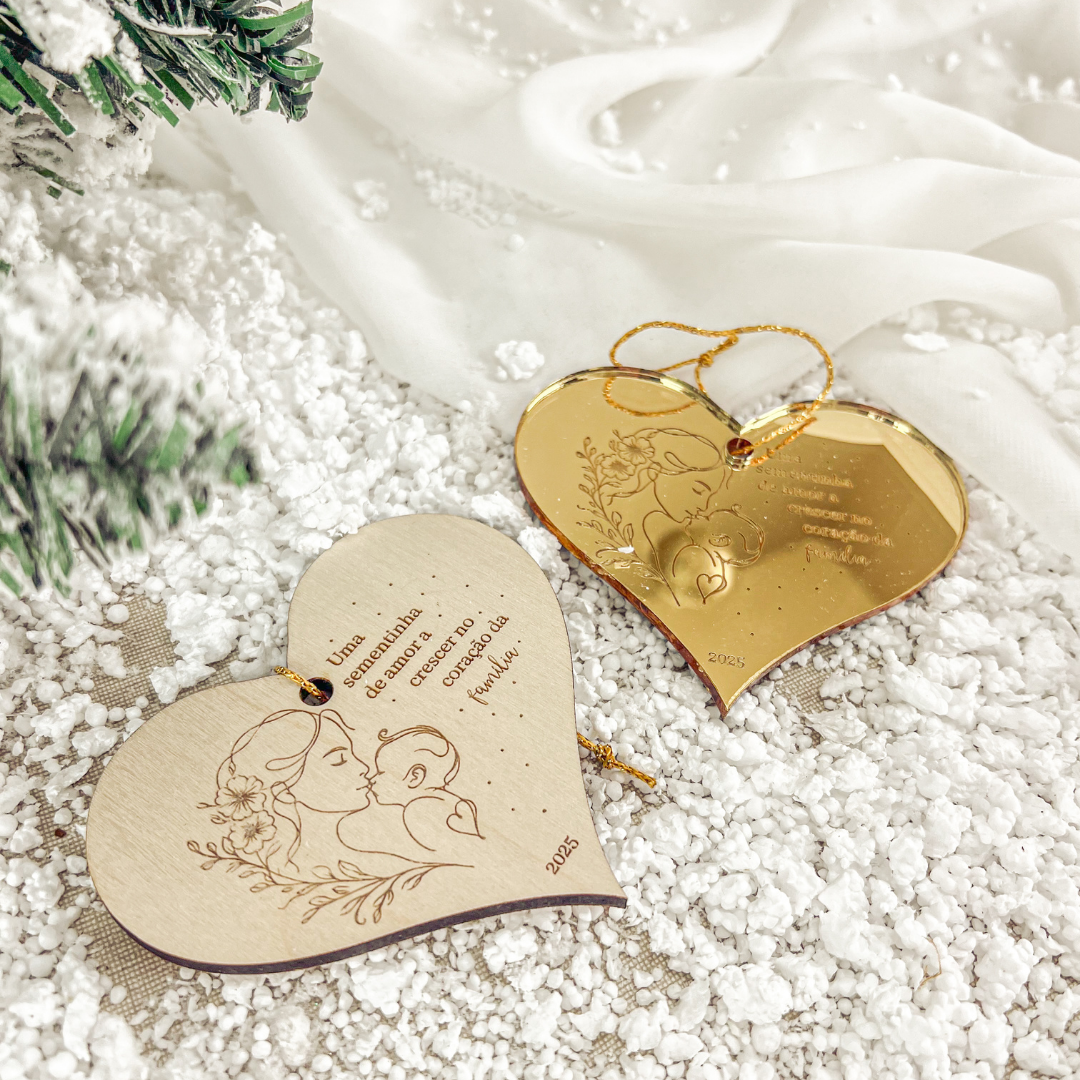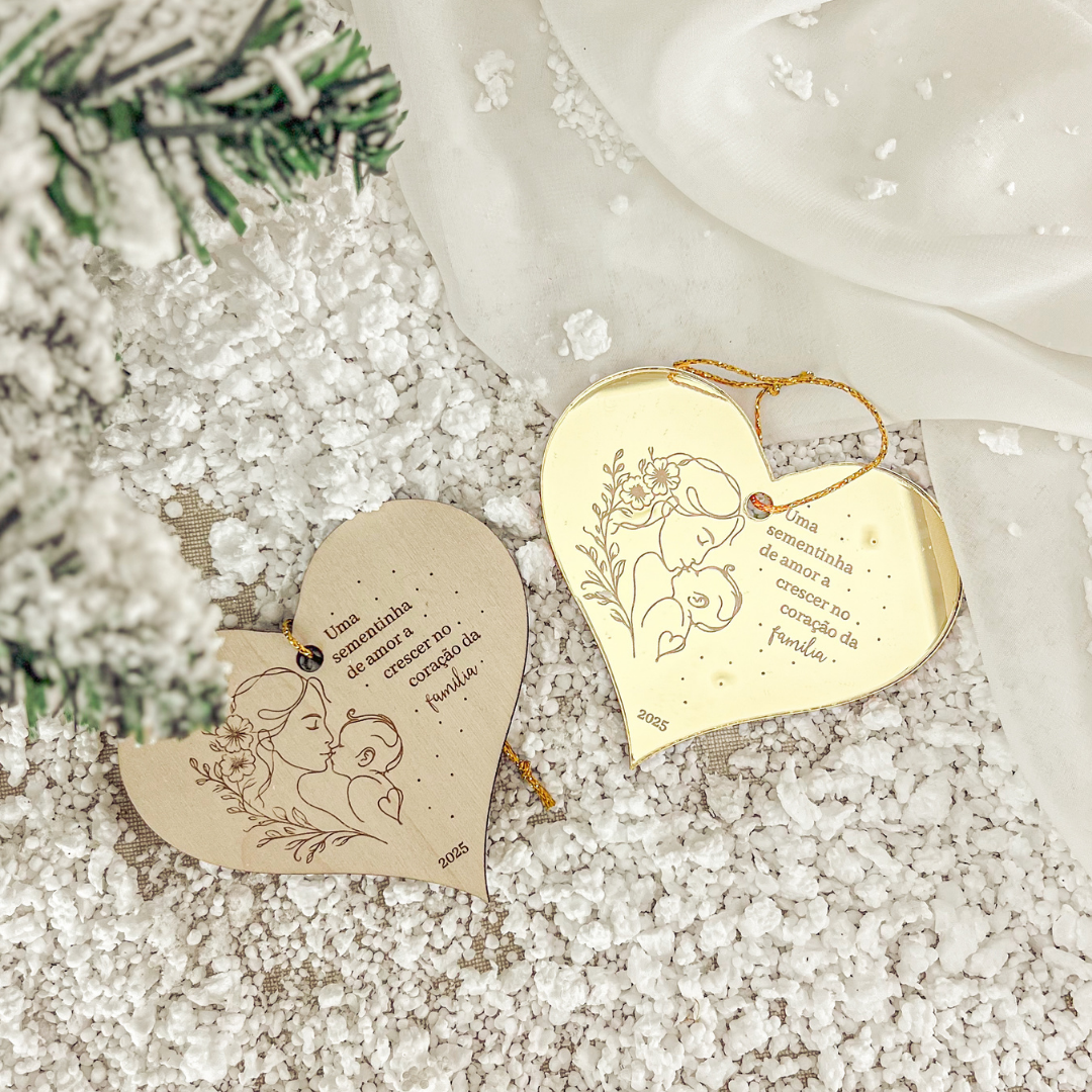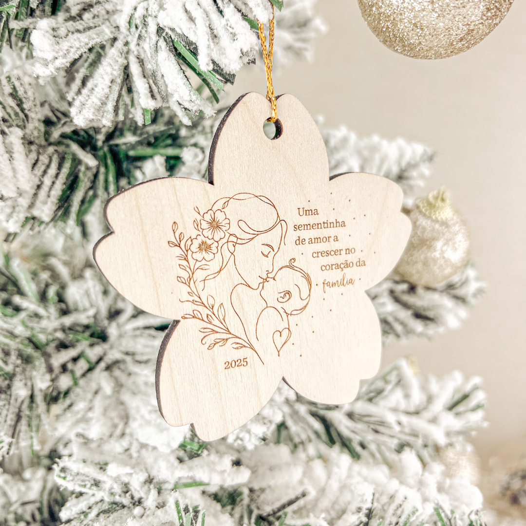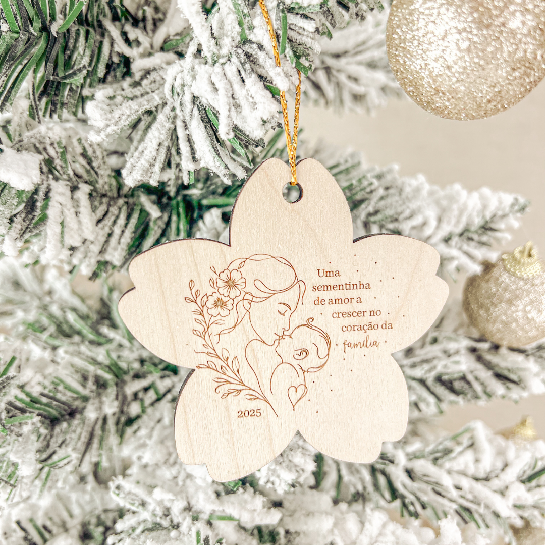 Com a frase “Uma sementinha de amor a crescer no coração da família” gravada na madeira, este ornamento representa o início de uma nova fase cheia de amor.