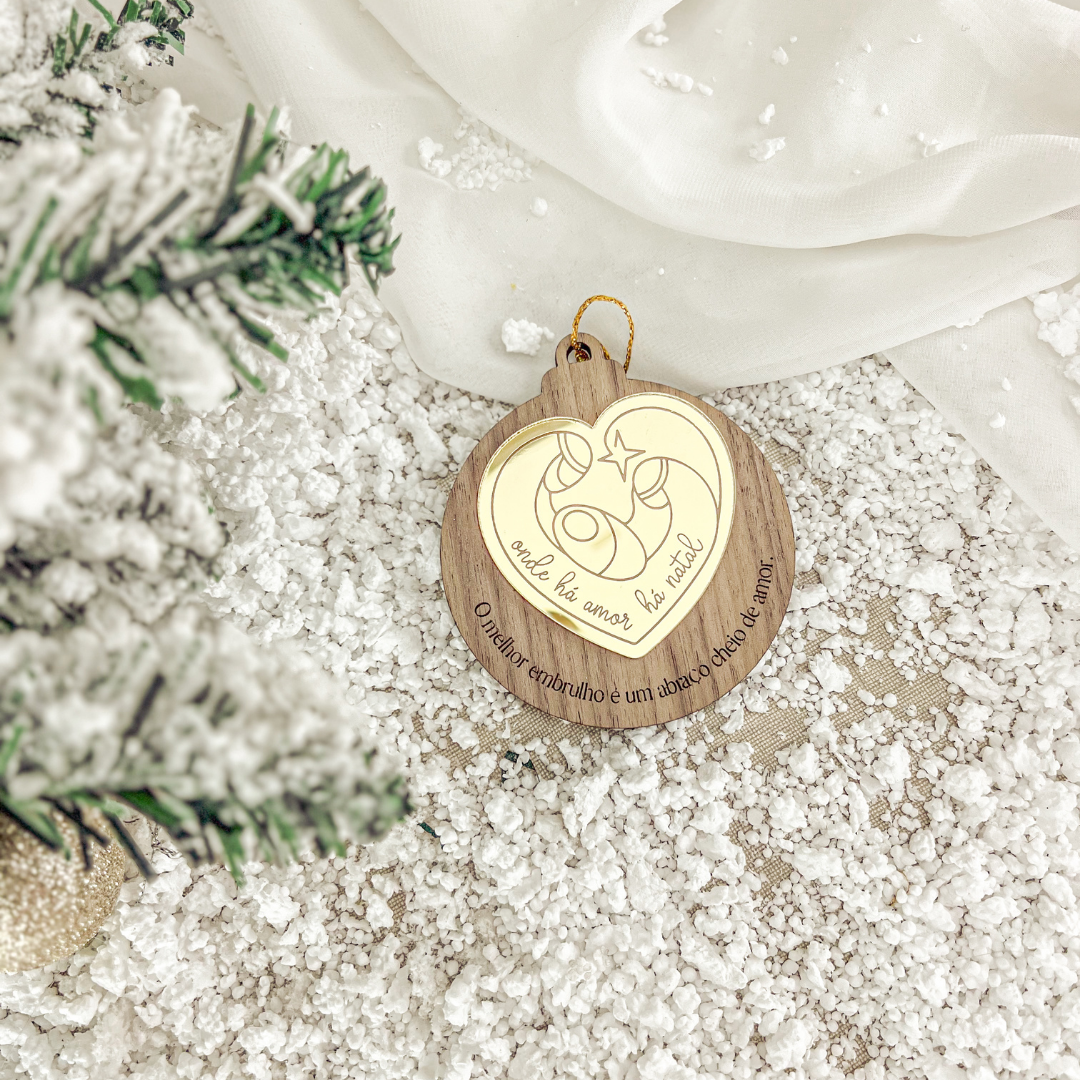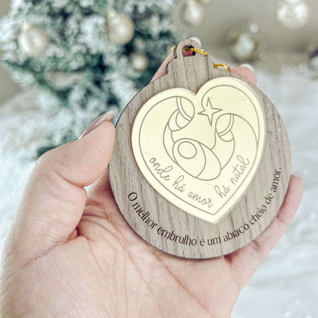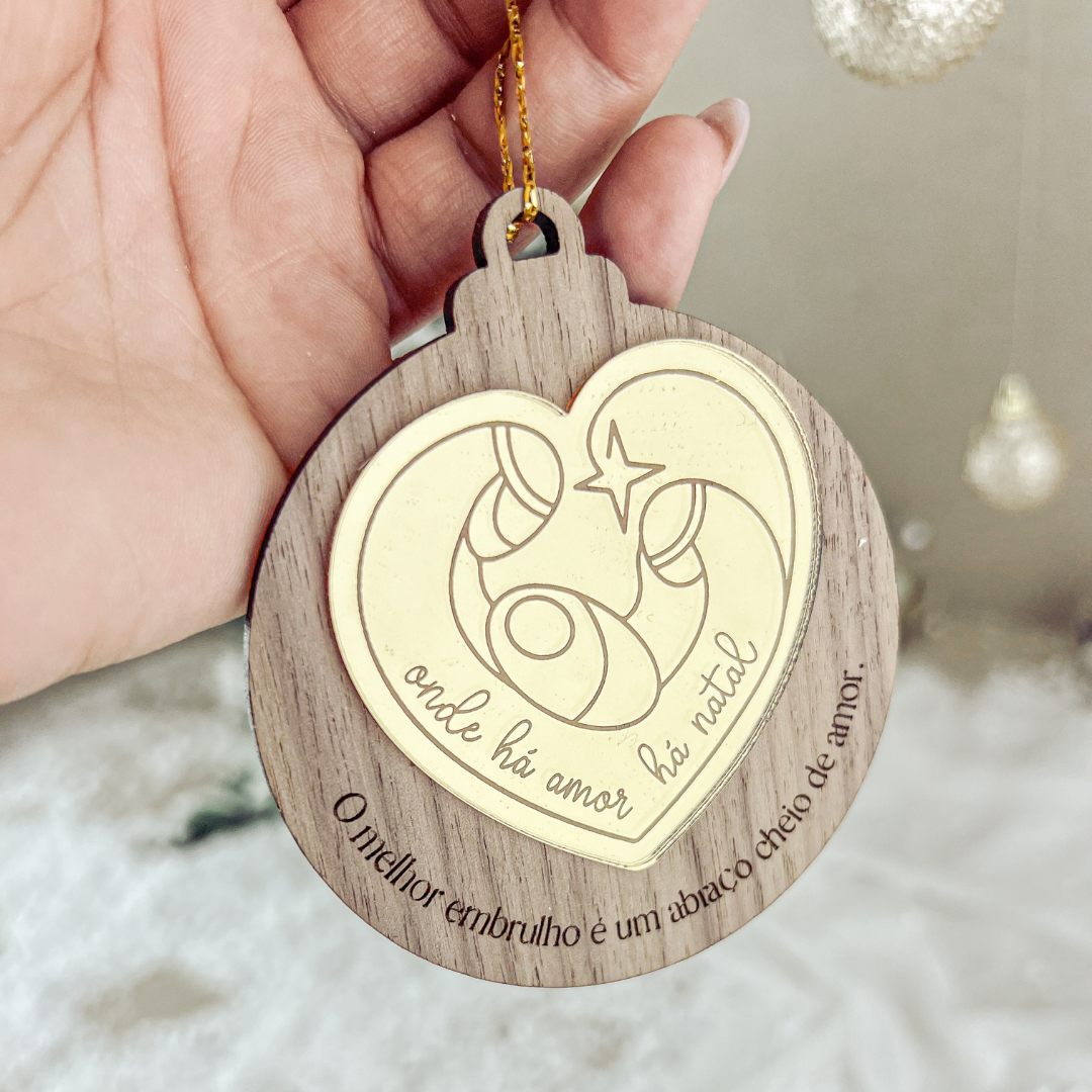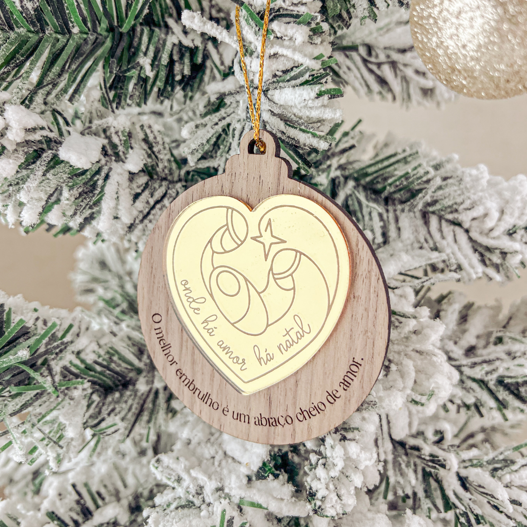 Feito em madeira de nogueira com coração dourado, é uma peça elegante e simbólica que celebra o amor e a união familiar — perfeita para decorar a árvore e encher o Natal de significado.