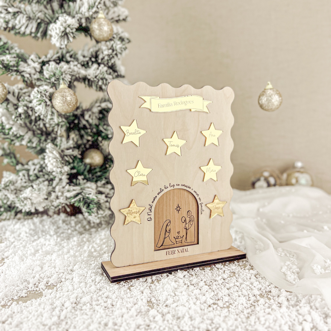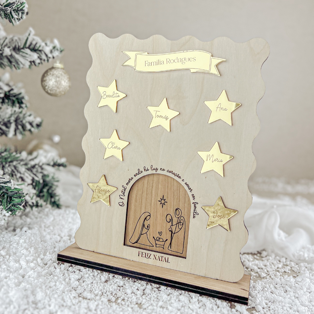 Esta placa decorativa em bétula e cerejeira apresenta o Presépio acompanhado de estrelas douradas com os nomes da família gravados, representando cada elemento (até 8 estrelas, mais mediante pedido).