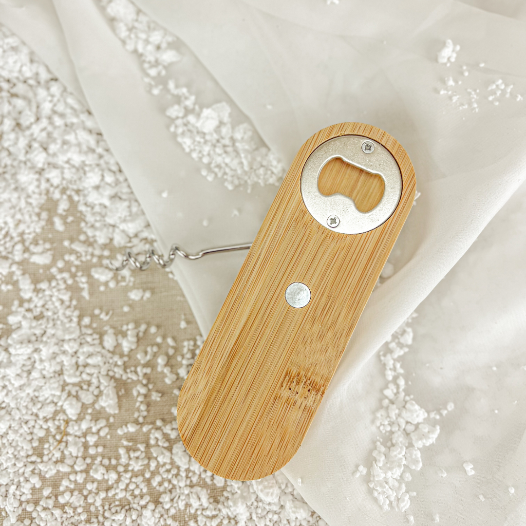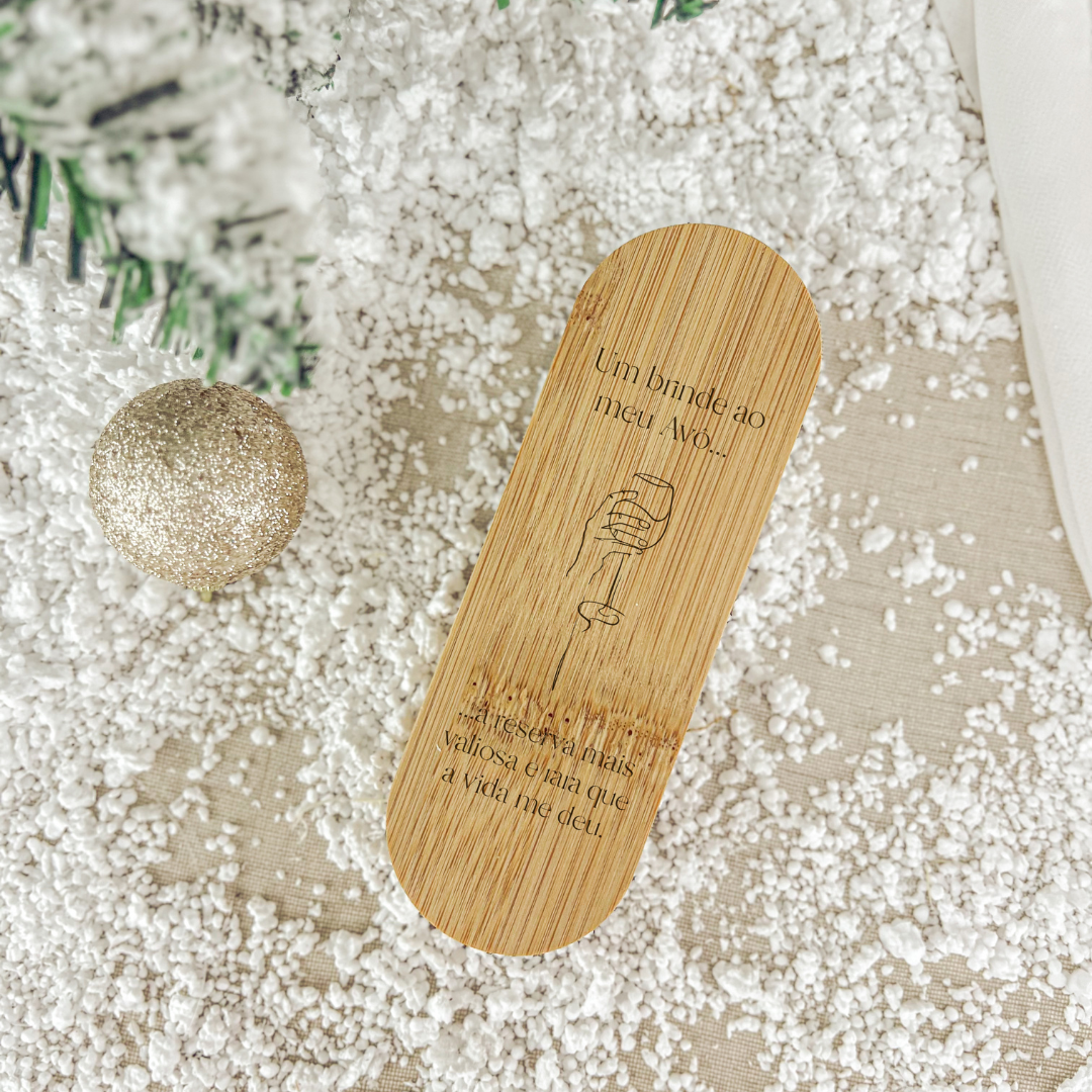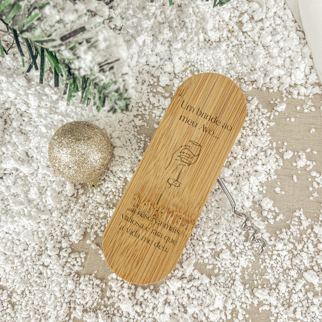 Feito em bambu natural com acabamento magnético, este saca-rolhas prático e elegante é uma peça útil que carrega uma mensagem cheia de afeto.
