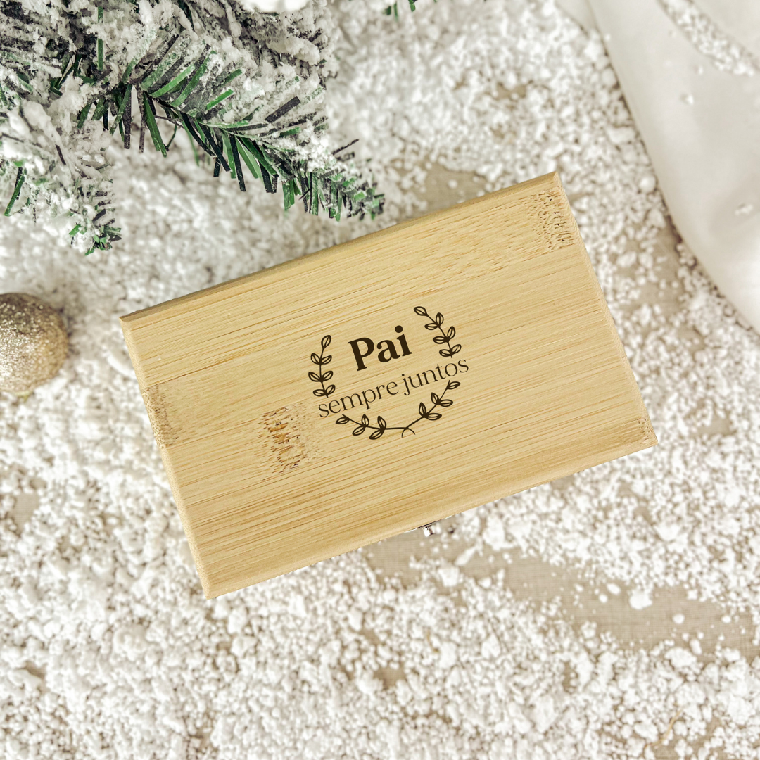 Caixa em bambu com gravação “Pai, sempre juntos”