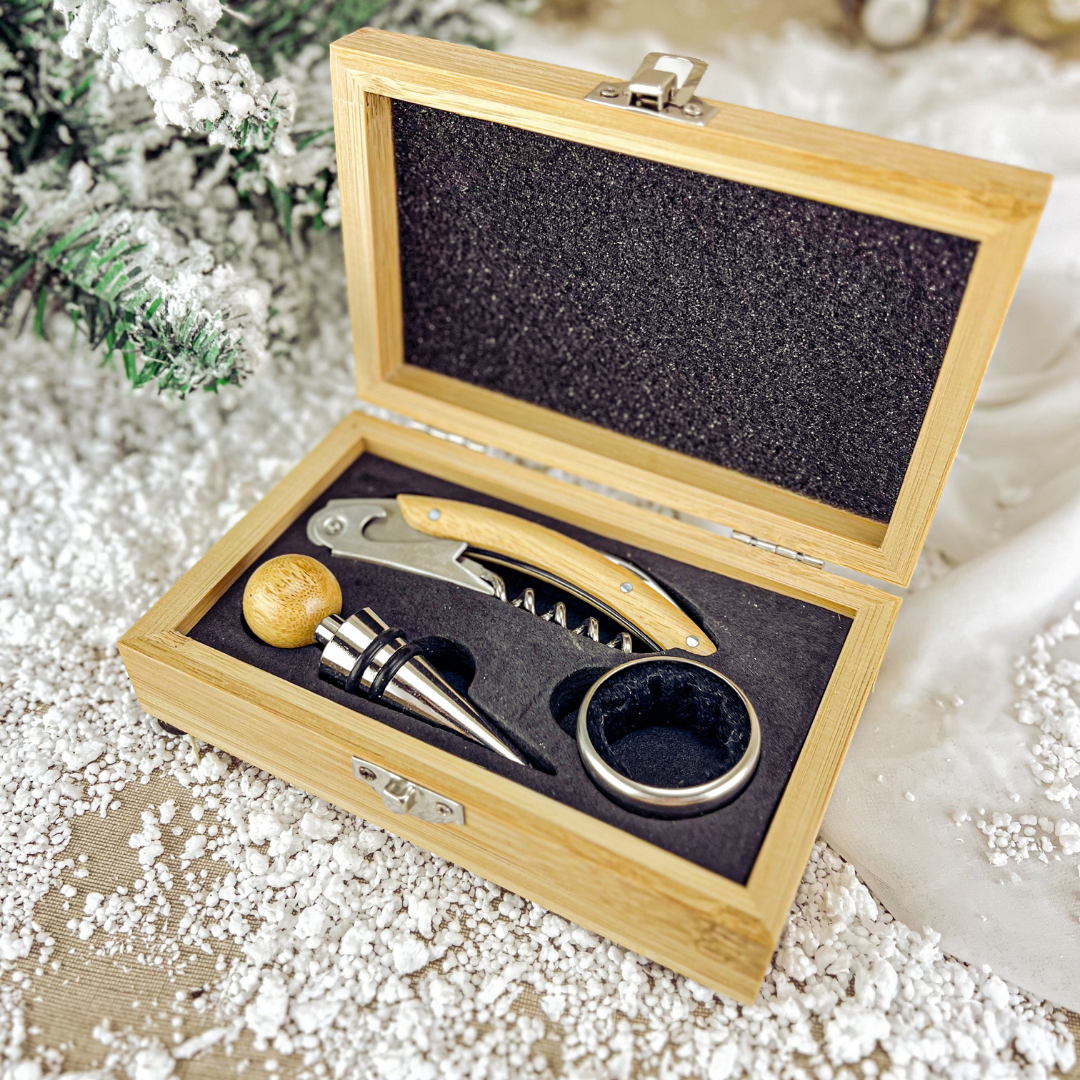 Este set de vinho em caixa de bambu natural inclui um saca-rolhas, dispensador e gotejador, combinando funcionalidade com um toque emocional.